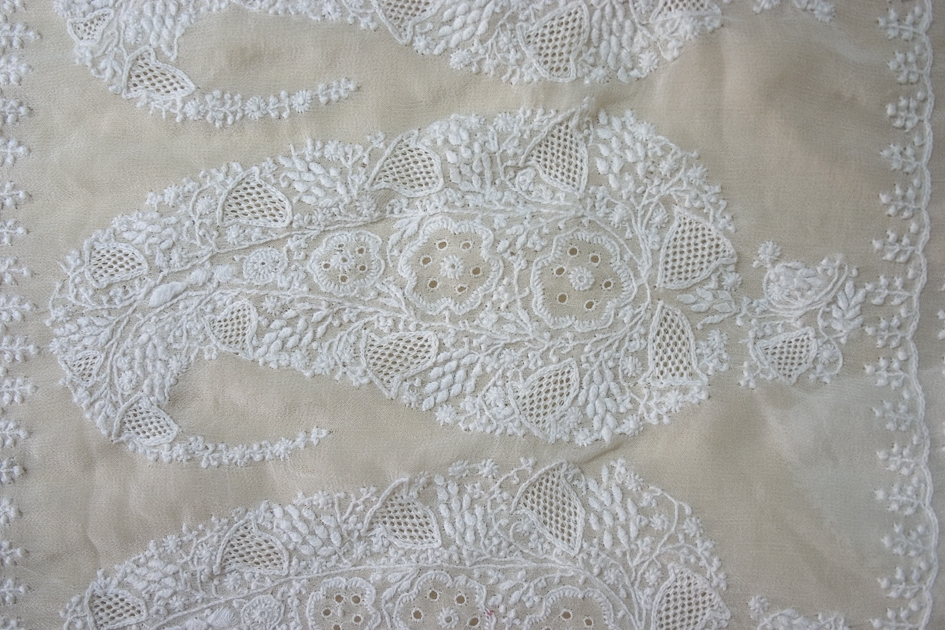 It was exciting to open the parcel even though I had watched Mr Singh pack it up. We started our journey with a return visit to Lucknow where we went back to see Mamta Varma and the young women who do wonderful chikankari – the most exquisite hand embroidery.  Here’s a detail of the embroidery worked on silk.