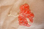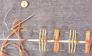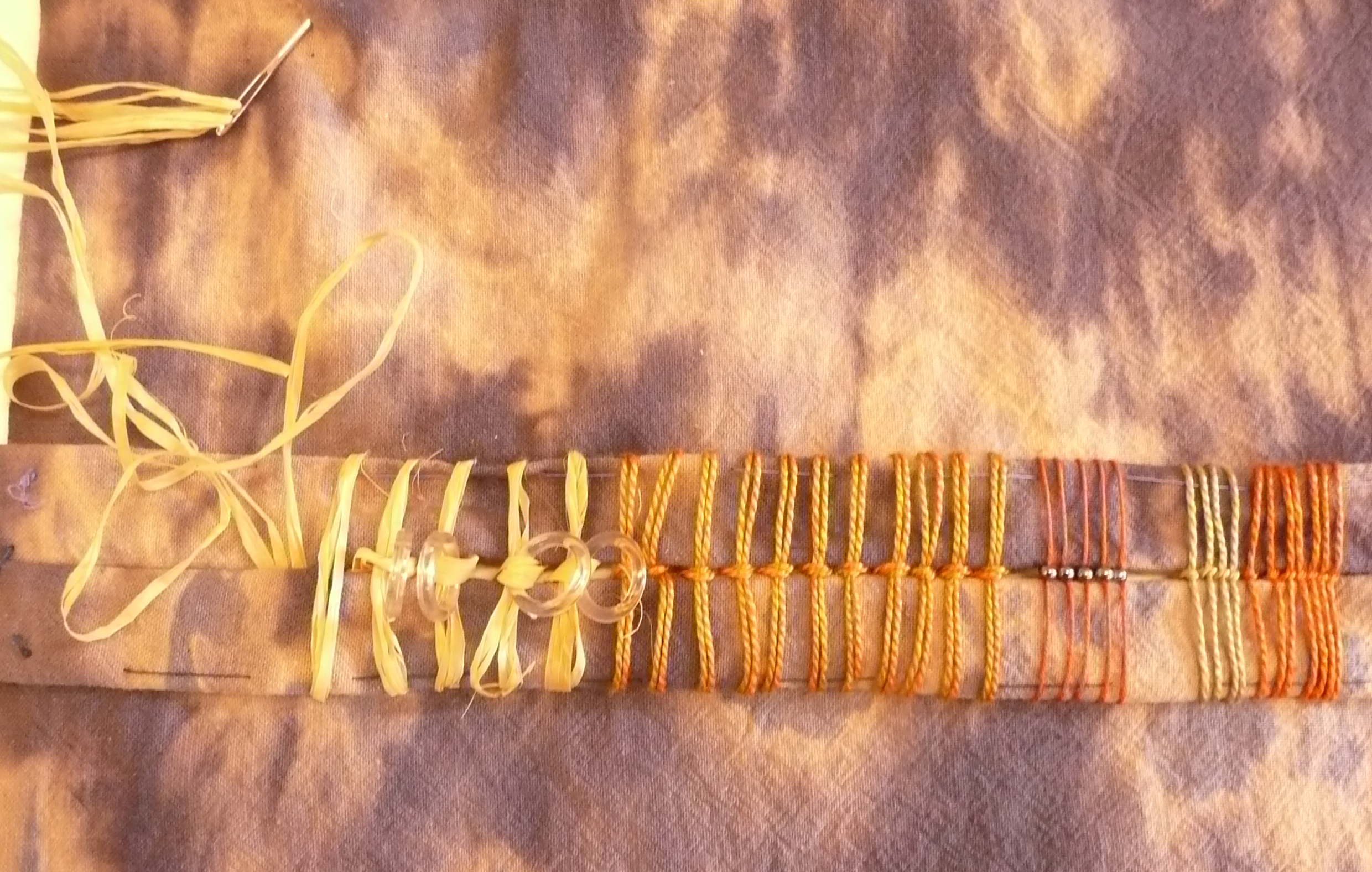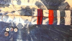 A Hausa robe, an Adinkra cloth and a raffia dance skirt were the inspiration for the workshop with members of the Guild. The eyelets on the robe are a lovely starting point, all massed together to create a wonderful surface.