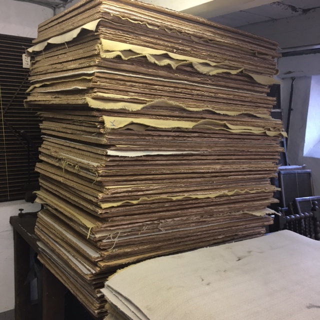 Here’s Sam in the process of making paper, showing wet sheets on couching felts and then stacked to dry.